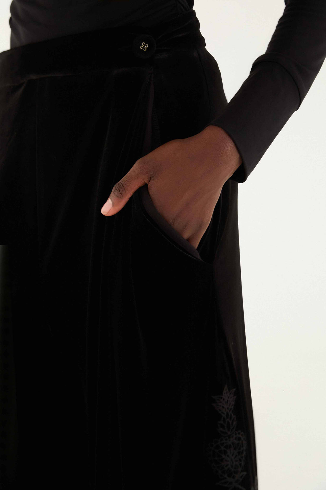 The Black Artichoke Heart Richelieu Pants embody elegance with their flowing wide-leg silhouette in sumptuous black velvet. Delicate Richelieu lace panels trace an artichoke-inspired pattern along the sides and scalloped hem, adding a whisper of intricate craftsmanship and subtle allure. These pants drape softly with movement, creating a harmonious blend of texture and finesse that invites a cozy yet sophisticated expression of style.