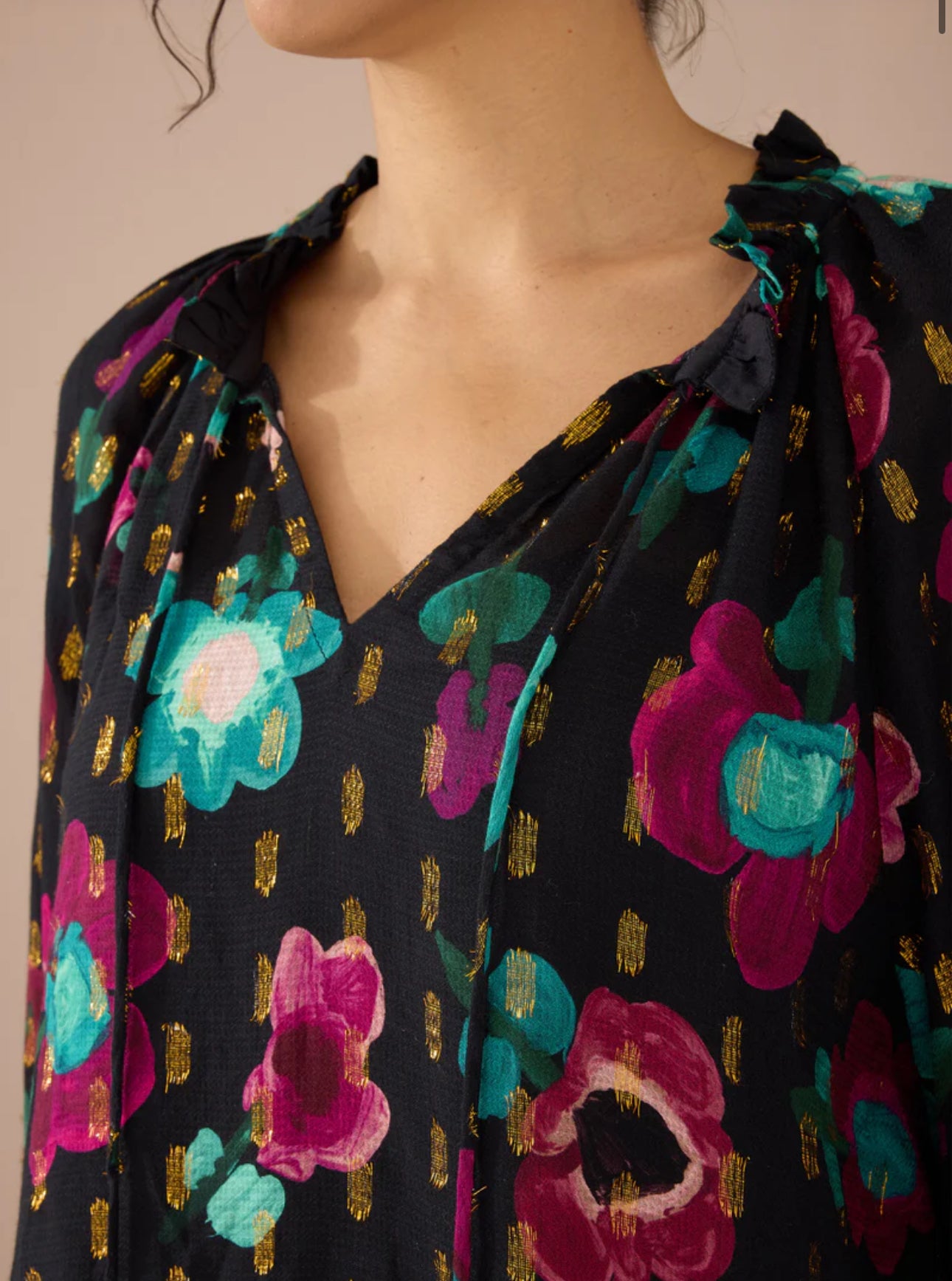 Long sleeve v-neck top that pairs great with denim or tucked into a skirt. Ruffle trim neck trim detail and optional adjustable neck tie.