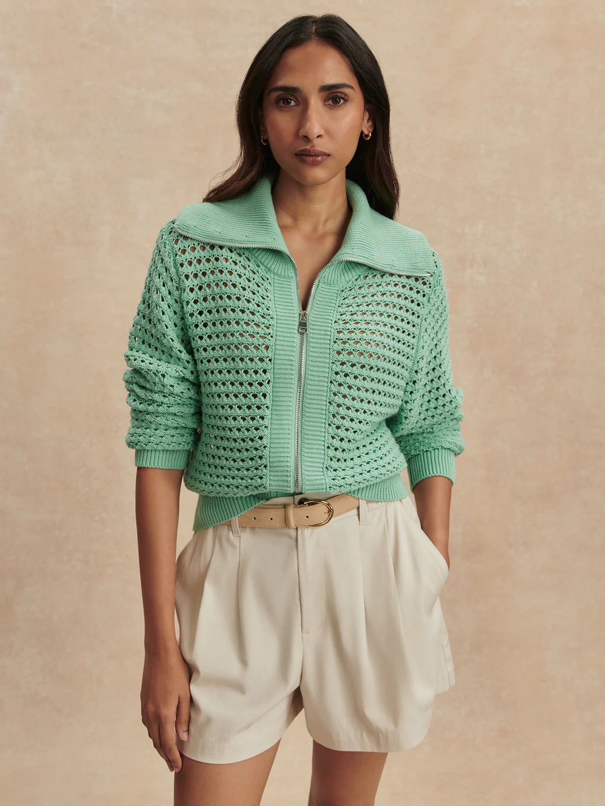 A pointelle knit jacket with a signature oversized collar and deep ribbed hem. Made in a textured open weave, the Eloise is lightweight and designed to be layered.