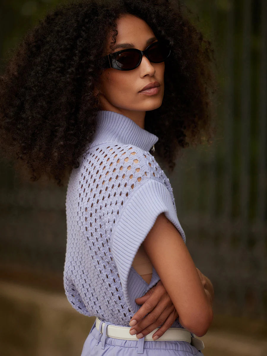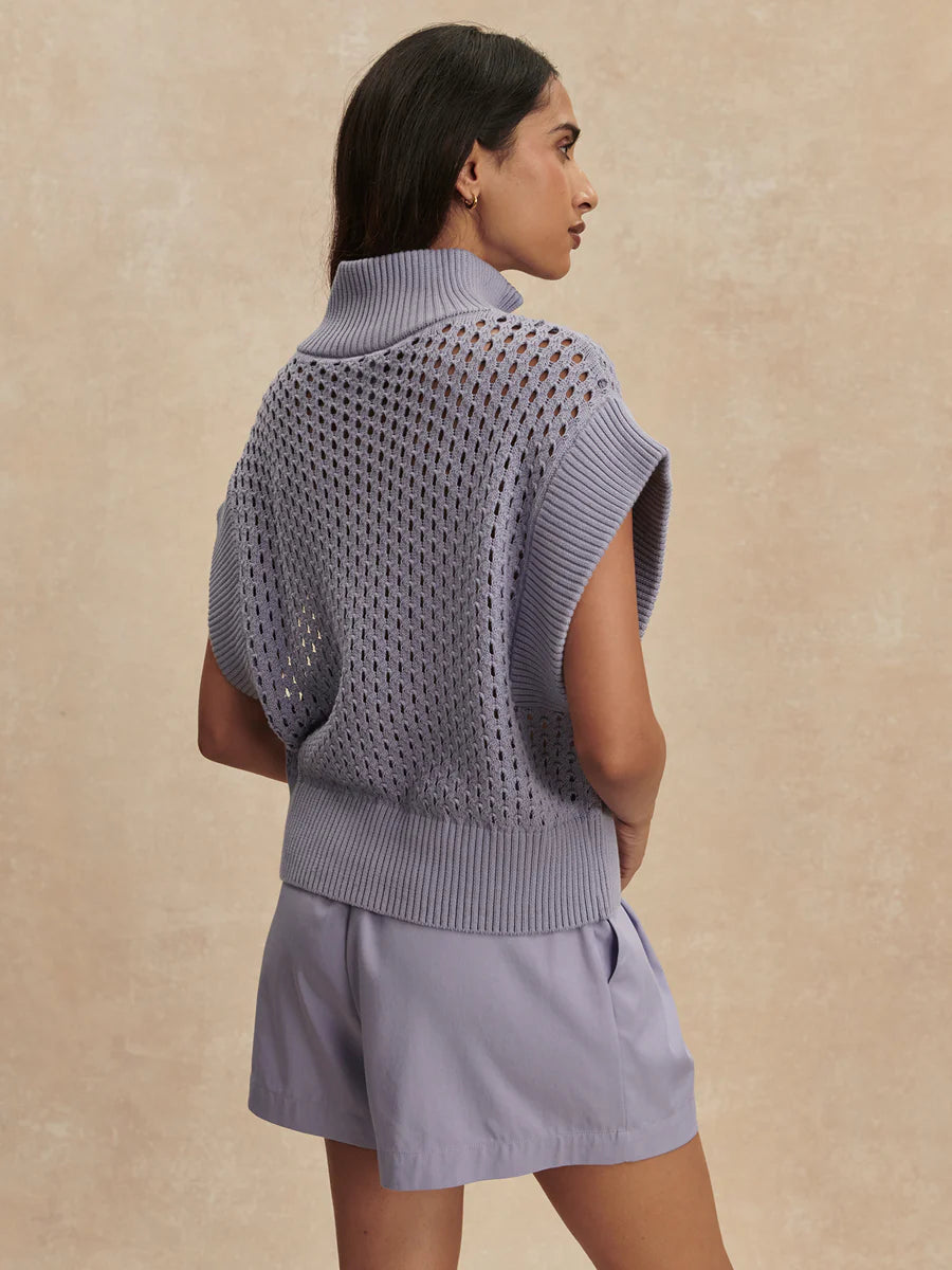 The Gaines boasts an oversized half-zip design with chic cap sleeves. Made in our textured Pineapple Knit, wear it with a bralette on warmer days and easily tuck it into shorts or pants thanks to the ribbed hem.