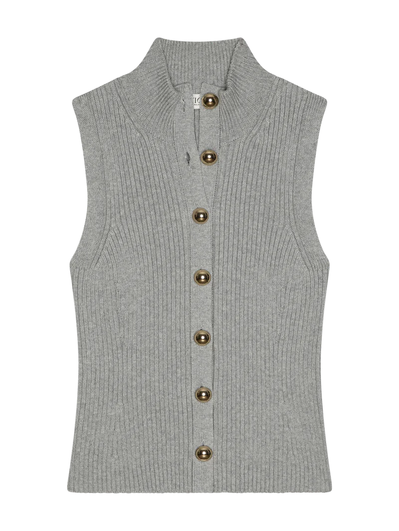 This timeless cotton cashmere sweater vest hits right at the hip and includes details like a mock neck, luxe ribbing, and gold dome buttons.