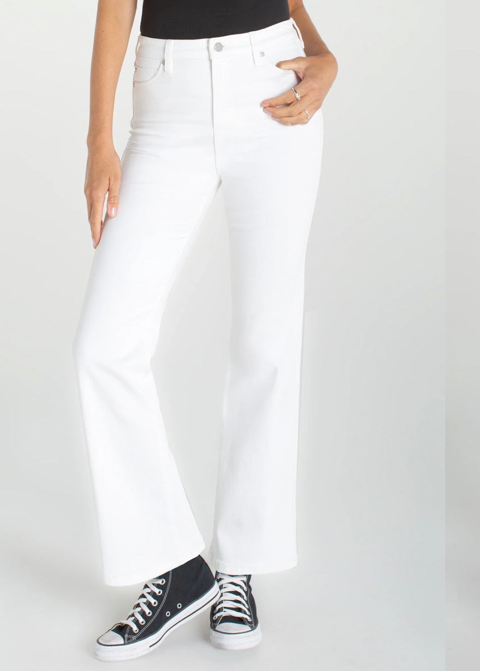 A sleek update to a forever flattering silhouette. The High Rise Lucy Bootcut in bright white delivers a smooth refined look with soft stretch that holds and moves beautifully. Clean lines and a modern fit make this pair an effortless choice for day or night.
