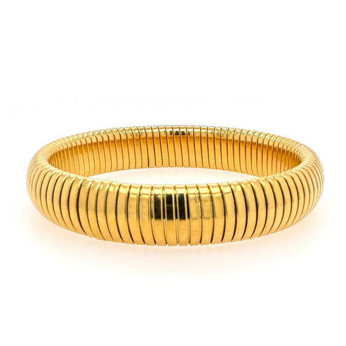 Introducing Shay- the perfect accessory for a touch of shine! This Omega Bangle Bracelet is both chic and durable. It is made of 18K plated Stainless Steel making it hypoallergenic and tarnish free. Elevate any outfit with this stylish piece.