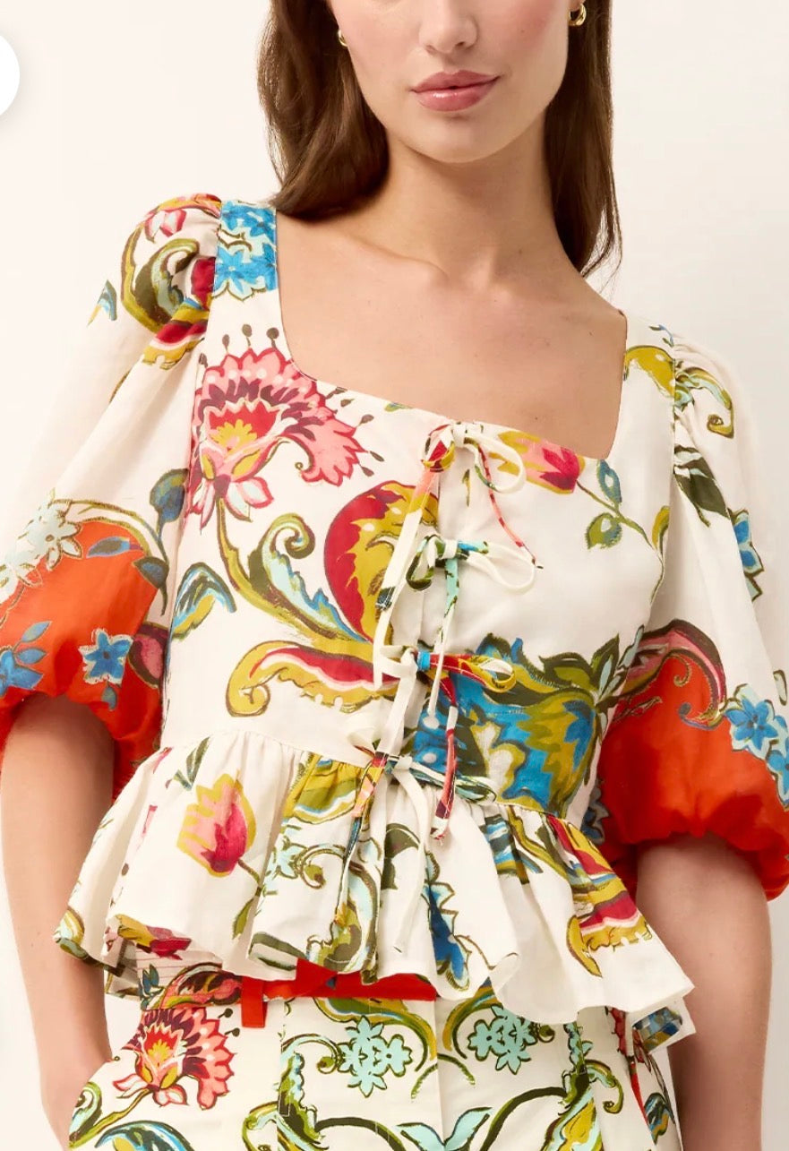 Tora is a playful, feminine top designed to make an impression. The square neckline with delicate front ties frames the décolletage beautifully, while softly puffed sleeves with elastic cuffs add gentle volume and shape. Tailored through the bodice with a clean back finish, it strikes the perfect balance between polished and fun. Finished in the vibrant Cartagena print, Tora pairs effortlessly with everything from tailored shorts to easy skirts for warm-weather days that call for color.
